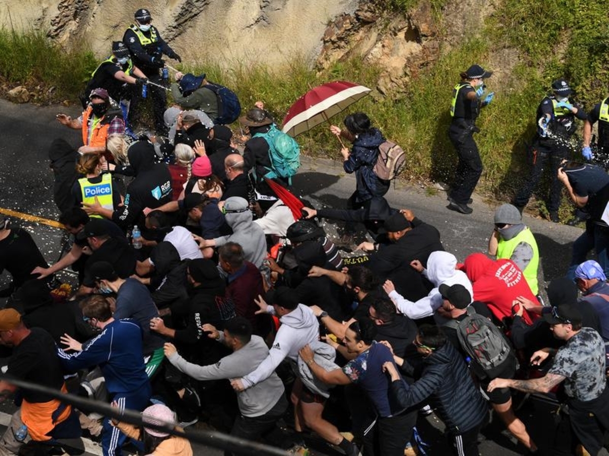 A Melbourne man has been charged with 20 offences after allegedly throwing a glass bottle and rocks at police officers during anti-lockdown and anti-vaccine protests.