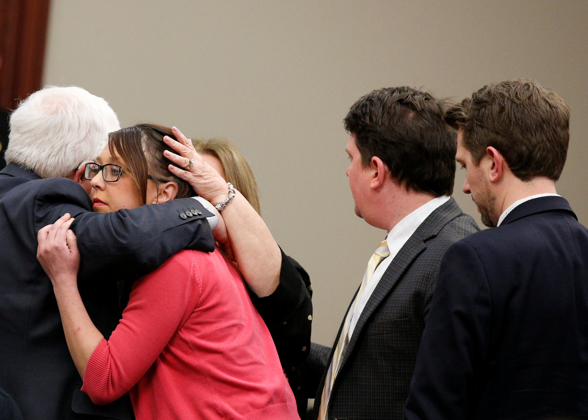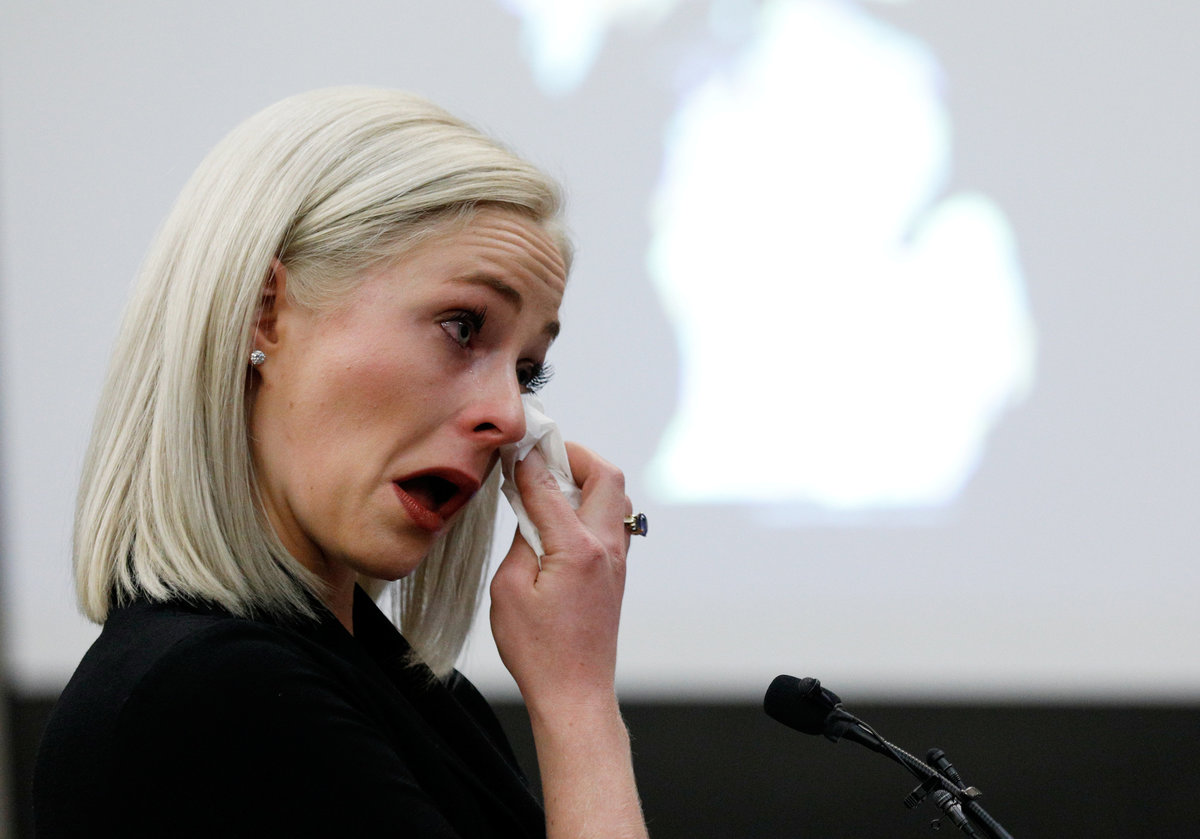 Kyle Stephens, pausing to compose herself during Nassar's sentencing hearing in a courtroom in Lansing, Michigan, said the doctor, a family friend, began molesting her when she was 6 years old and her parents did not believe her when she told them.