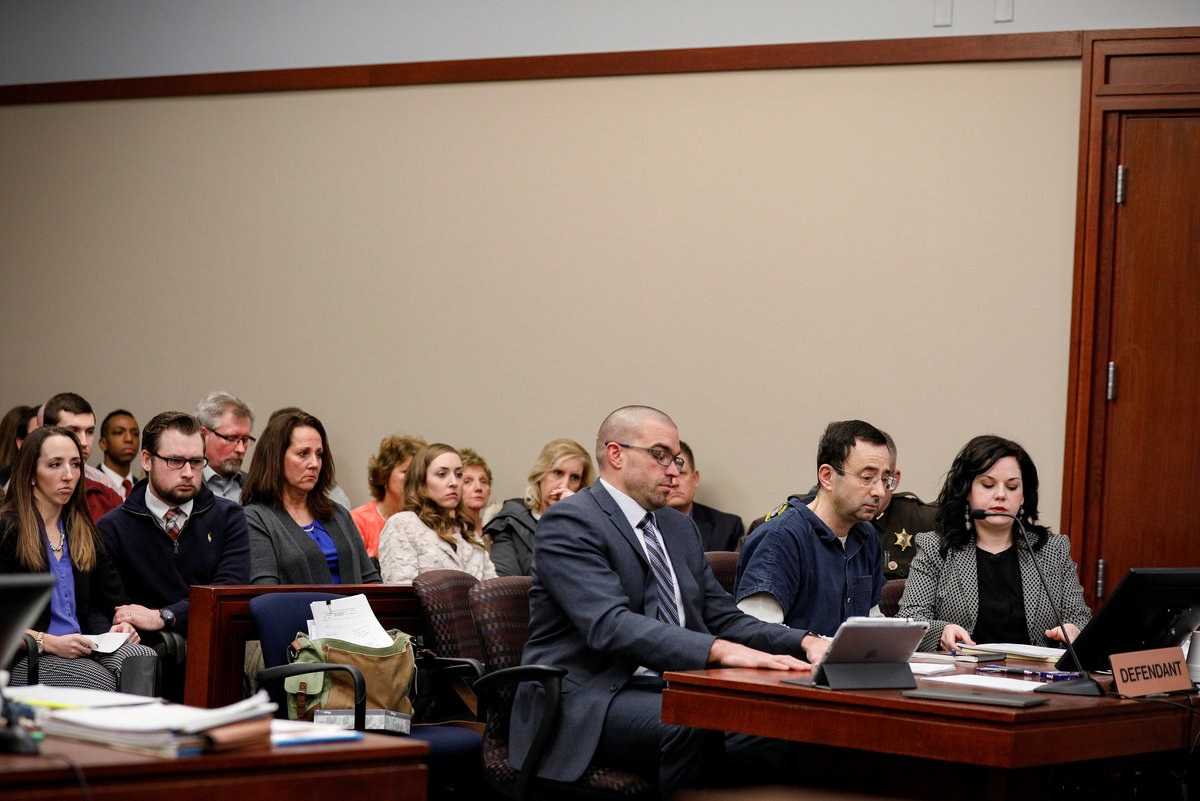 Attired in blue prison garb, Nassar sat with his head down on Tuesday and did not appear to make eye contact with the victims when they addressed him directly. At one point, he took off his eyeglasses and dabbed his eyes with a tissue.