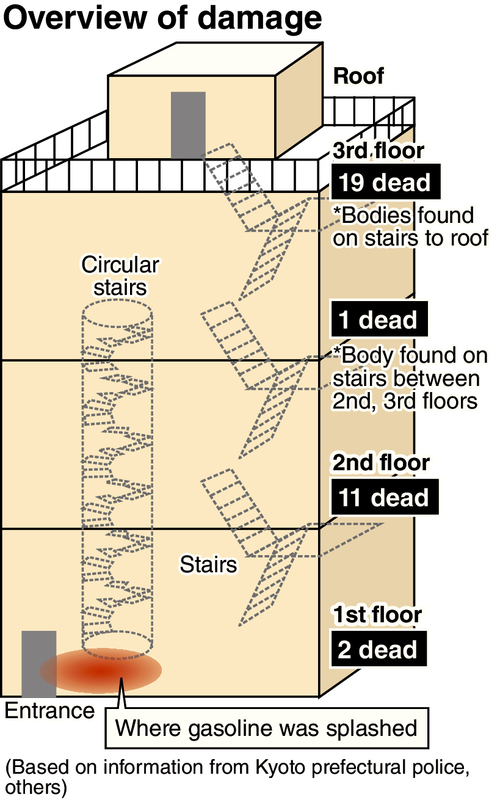 KYOTO -- Roaring flames and the sounds of explosions ripped through the studio building of animation production company Kyoto Animation Co. in Fushimi Ward, Kyoto, on Thursday morning, killing 33 and leaving some in critical condition.