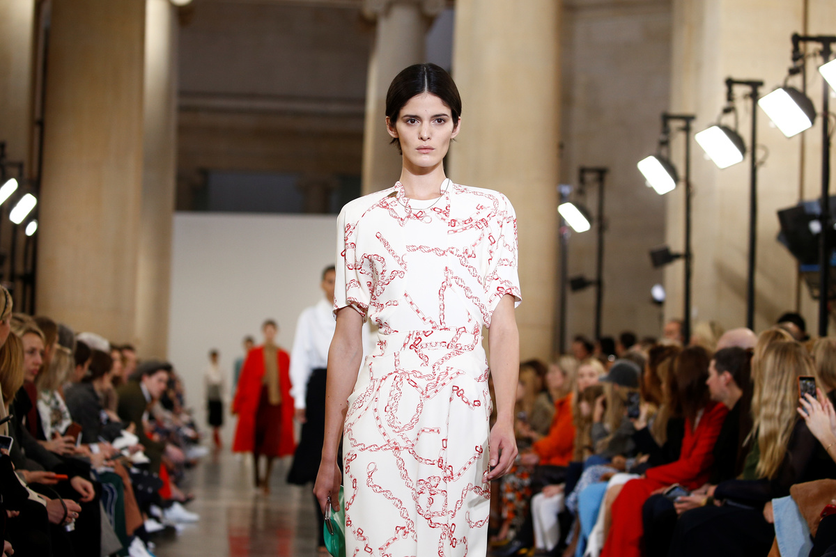 In front of an audience including Beckham's husband David and their children, models wore dresses and skirts slim fitted over the knee, some with abstract chain patterns.