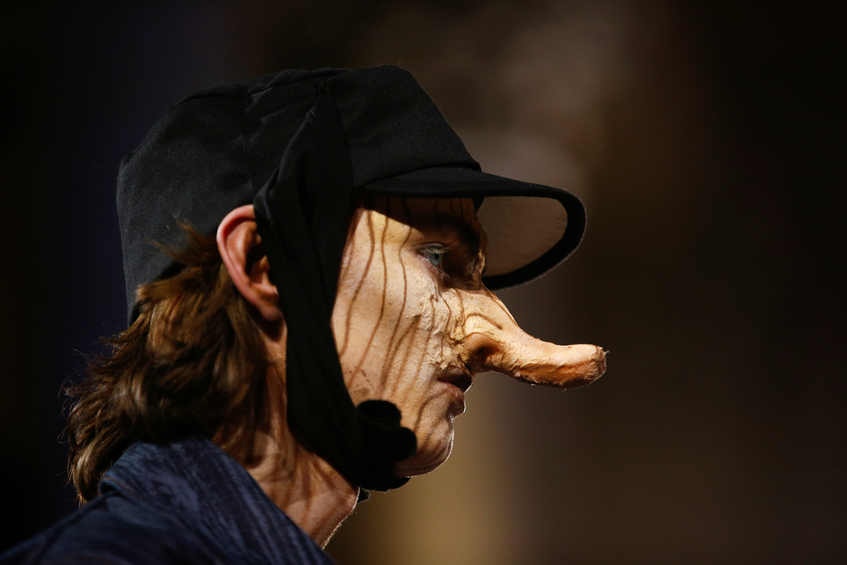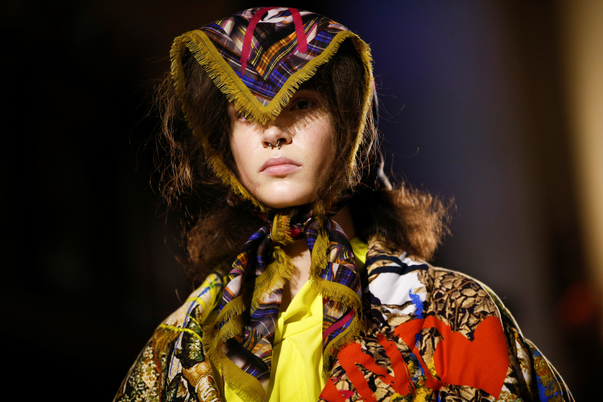 Both women and men took to the catwalk. Some wore Pinocchio-like long noses. Knotted headscarves were worn back to front.