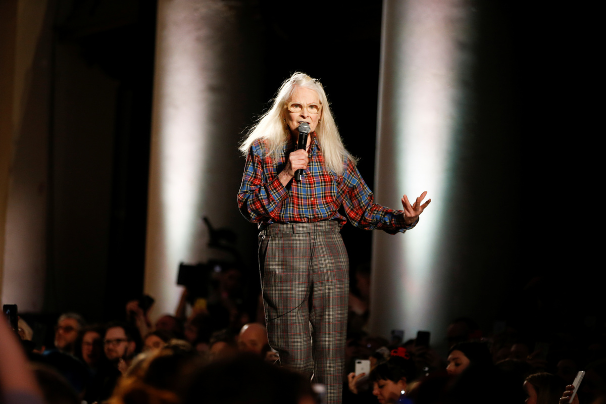 Designer Vivienne Westwood on stage following her catwalk show at London Fashion Week Women's A/W19 in London, Britain February 17, 2019. REUTERS/Henry Nicholls