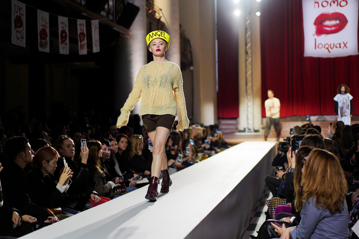 The 77-year-old, known for her environmental activism, allowed her models, which included actress and anti-harassment campaigner Rose McGowan and other campaigners, to address various issues as she presented an eclectic mix of creations.