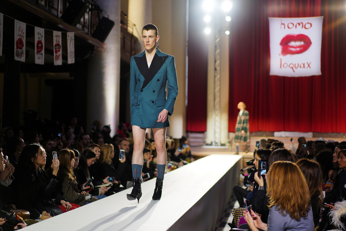 Britain's dame of fashion Westwood gave models a voice on her "homo loquax" catwalk.