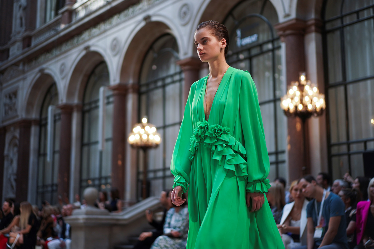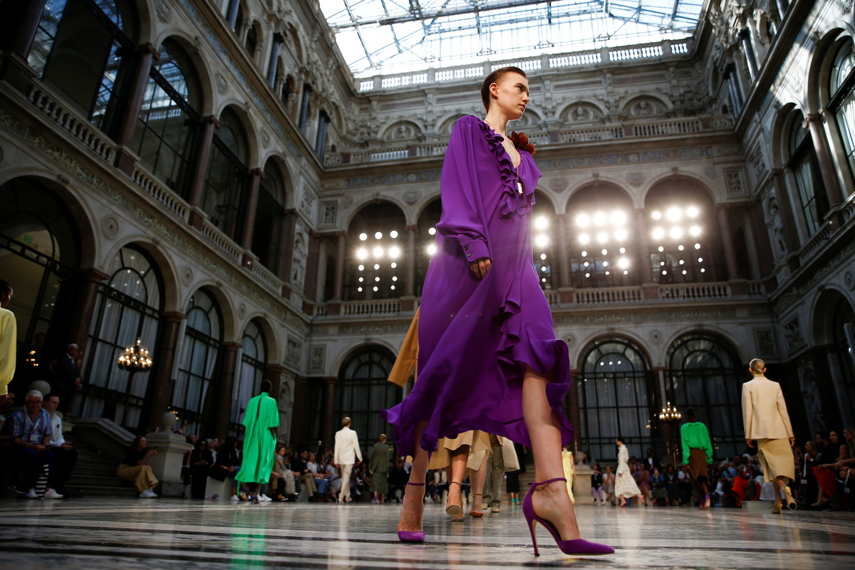 Dresses came in purple, yellow, green, bronze, black and softer colors, and were cut in various styles: from halterneck and asymmetric to low-cut and long-sleeved. Most had feminine ruffles on the neckline, shoulders or waist. Some had floral patterns.