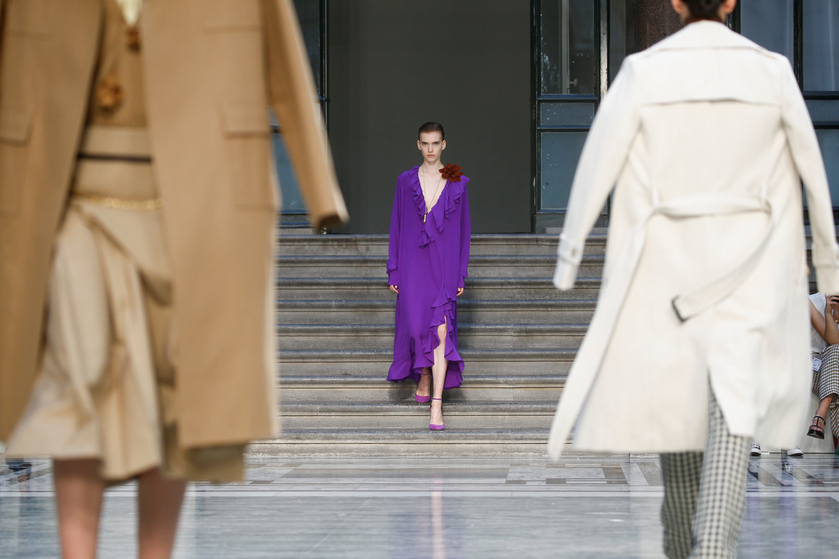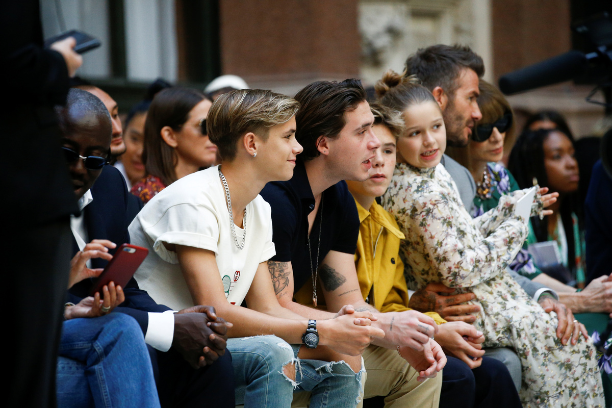 With her husband David and their children watching from the front row, Beckham said the spring/summer 2020 collection highlighted her love of contrasts, mixing tailored suits with floaty dresses and pale neutrals with bold colors.