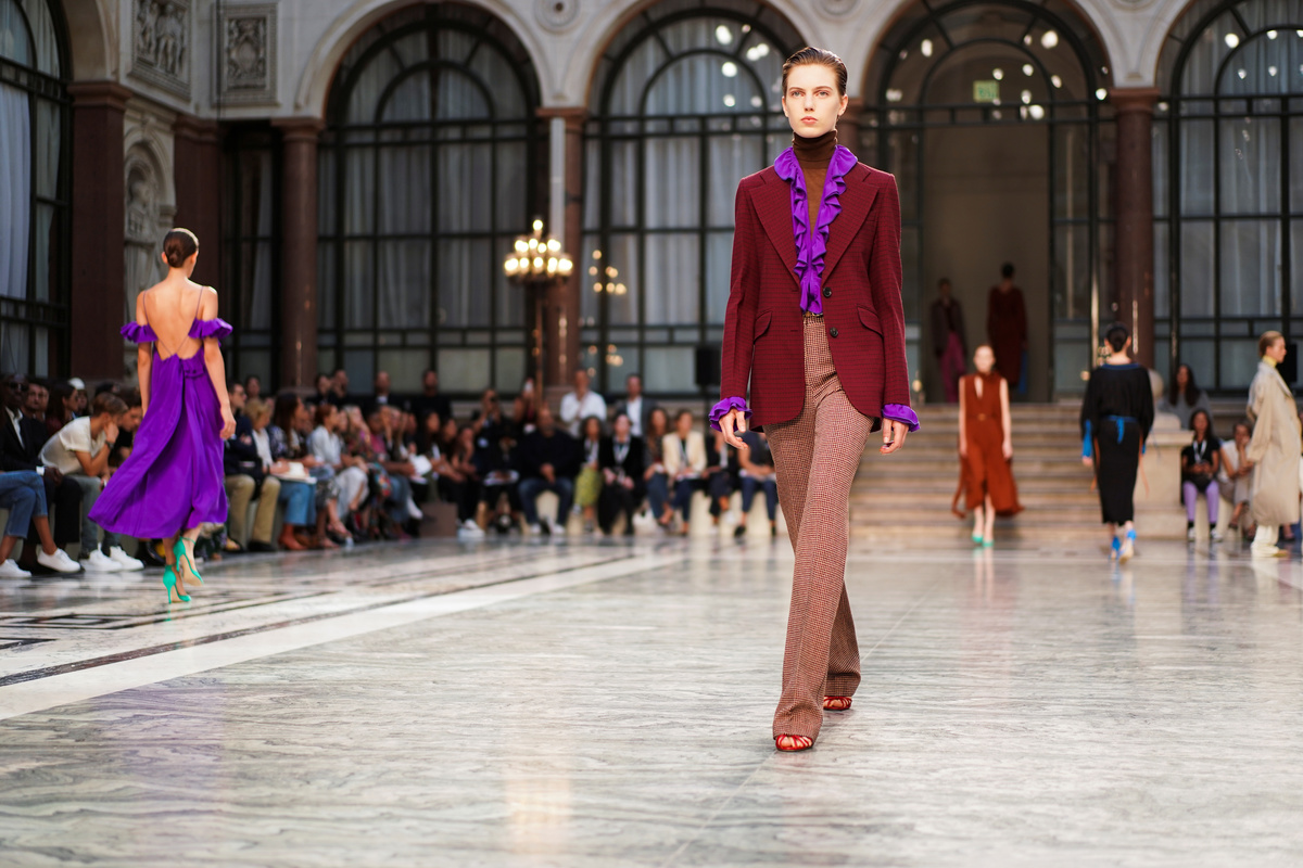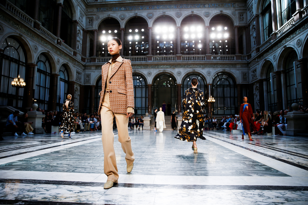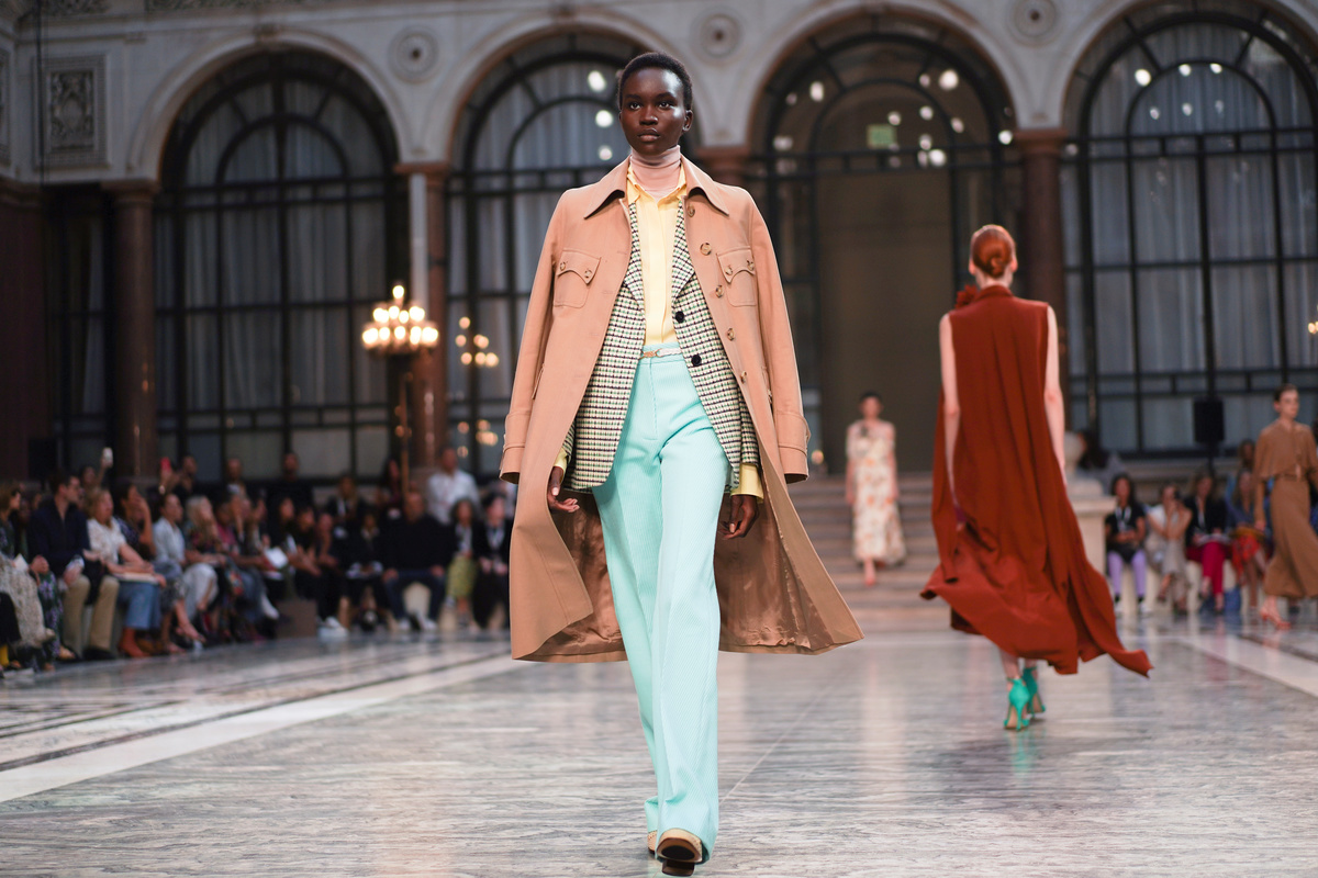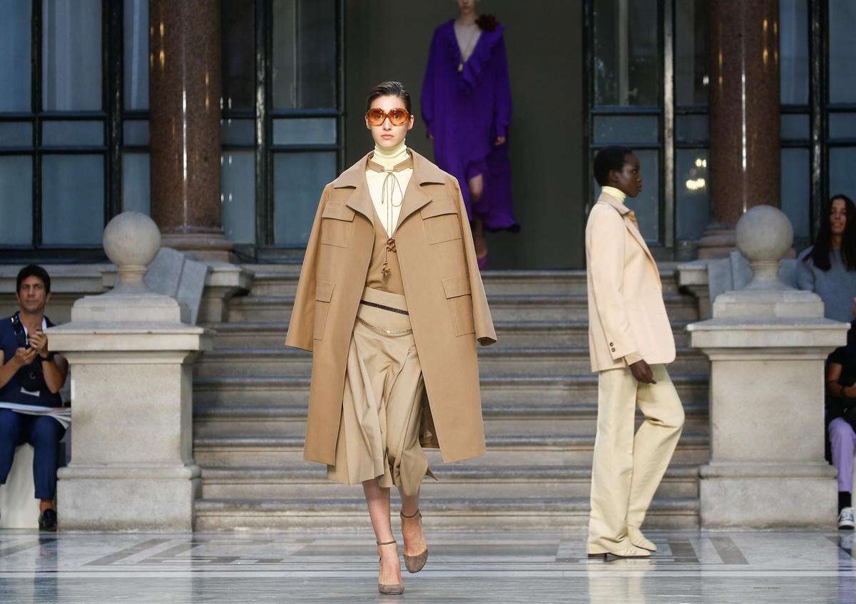 The former Spice Girl turned designer, who has also launched a beauty line, opened the show with sharp trouser suits in check, cream or light colors.