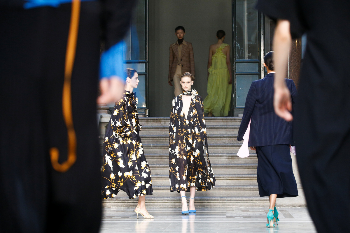 Ahead of the show, around 30 demonstrators from climate activist group Extinction Rebellion staged a protest outside the venue, the Foreign and Commonwealth Office, seeking to draw attention to the fashion industry's impact on the environment.