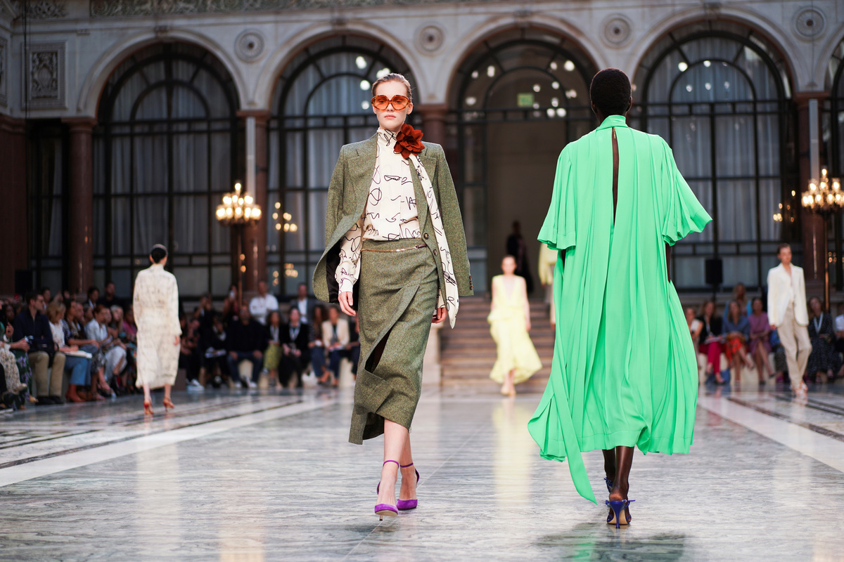 Preen designer duo Justin Thornton and Thea Bregazzi opened the show with black and white looks before presenting an array of pastel-colored lace, silk and see-though ruffled frocks.