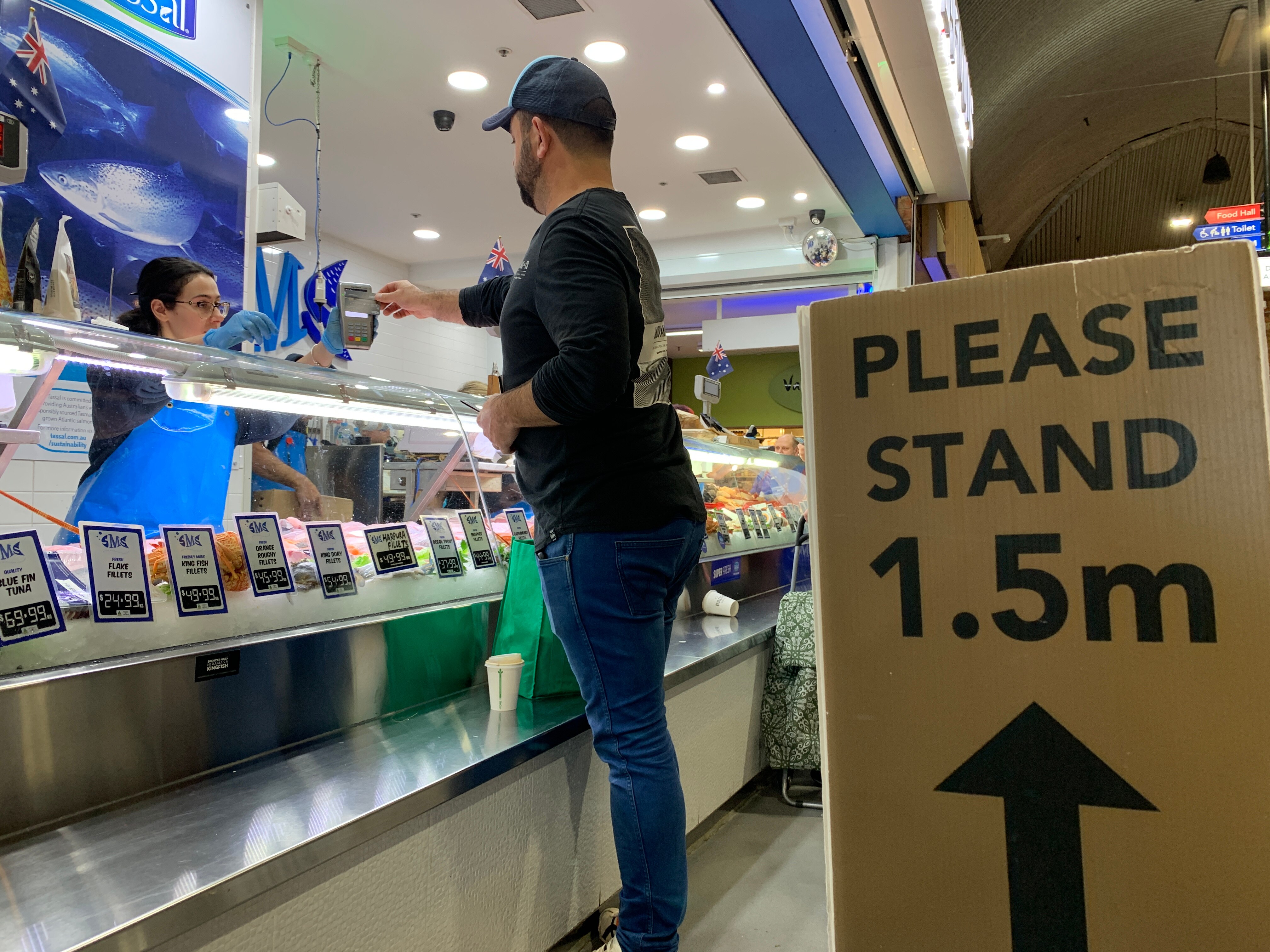 At South Melbourne Market, social distancing measures are in place and there are visible reminders to check-in with a QR code.