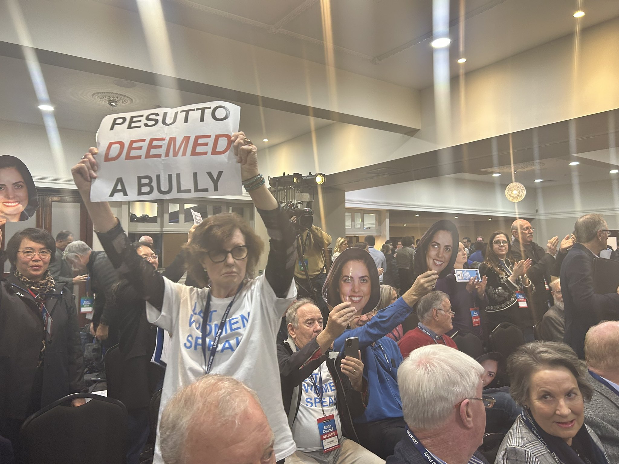 One member held up a sign saying "Pesutto deemed a bully".