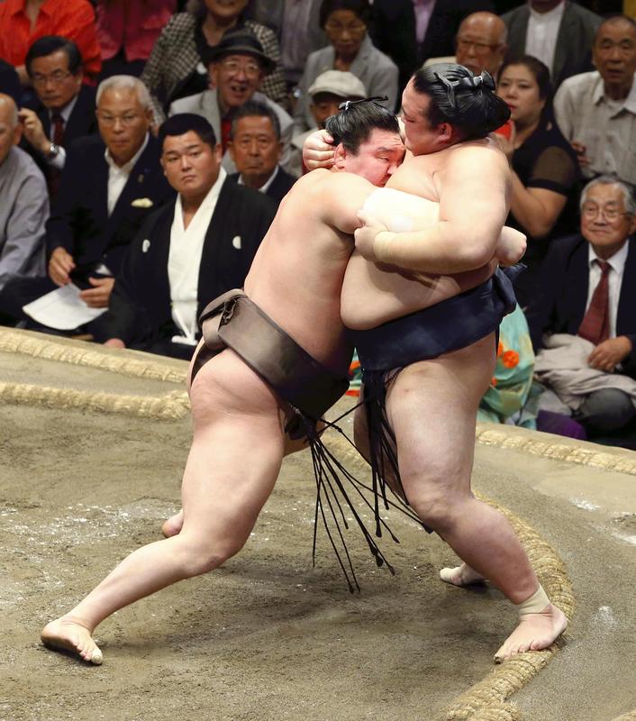 Meanwhile, ozeki Tochinoshin, who is under "kadoban" status that requires him to collect a majority of wins in the 15-day tourney to retain his rank, suffered his sixth loss. He went down to No. 3 maegashira Shodai (6-7), who tenaciously resisted the ozeki's attack and eventually threw him to the surface.