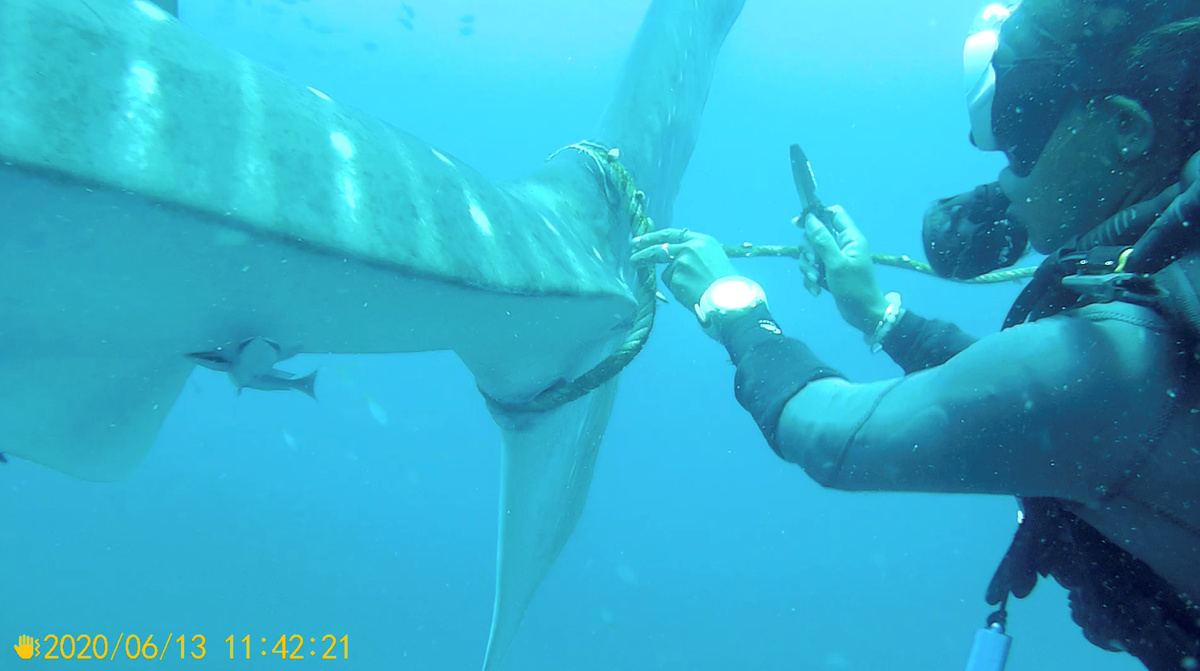 A dive group spotted the shark off the island of Koh Tao on Saturday and tried unsuccessfully with a small knife to remove the rope, which had cut into the tail, leaving a wound. It was not known how the whale became tangled in the rope.