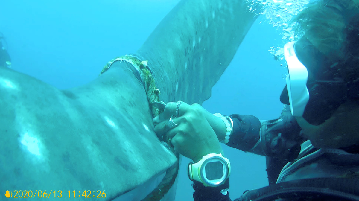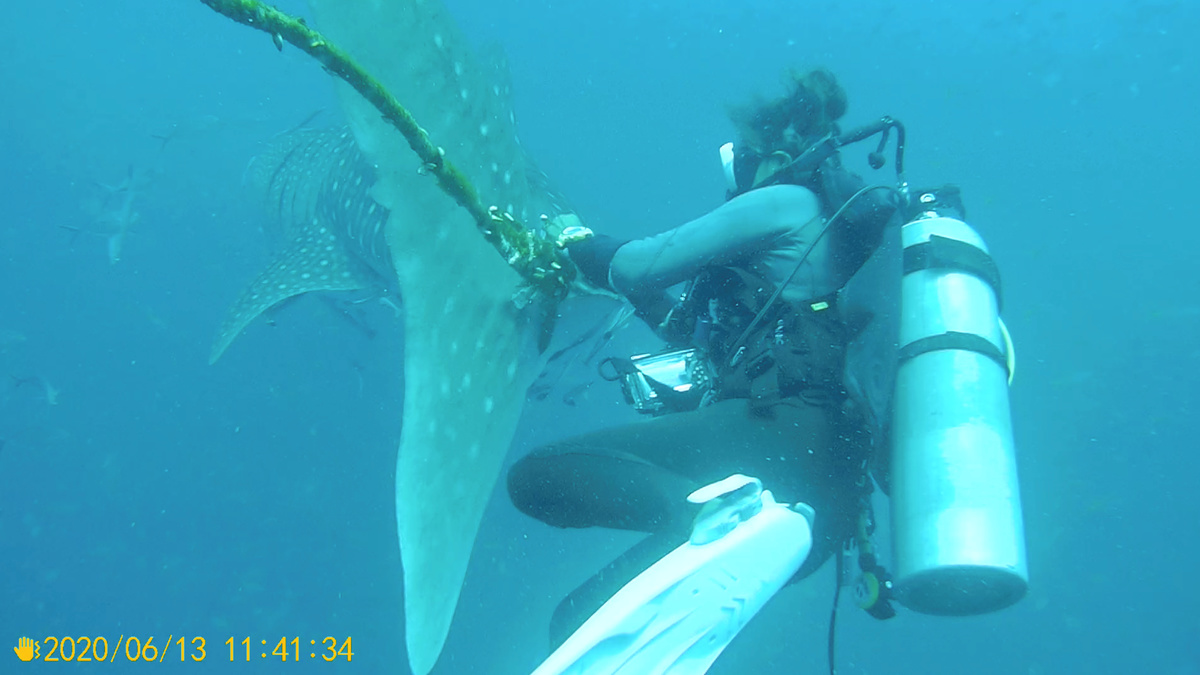 Divers in Thailand have captured dramatic footage of their efforts to free a huge whale shark in distress from a piece of nylon rope caught on its tail.