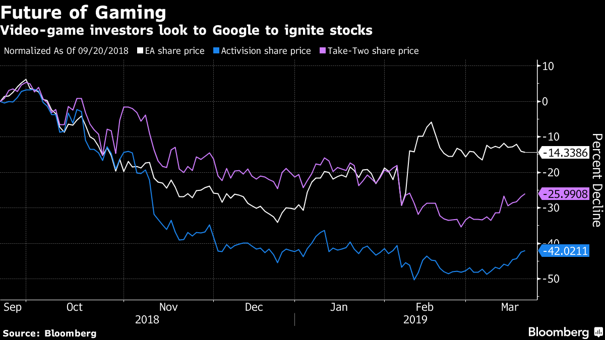 Google’s foray into gaming could also lead to more deal-making in the space. BTIG LLC analyst Brandon Ross said in a March 17 note that he expects big tech companies will look to buy video-game publishers. Post also sees potential acquisitions of gamemakers as well as attractive content licensing deals.