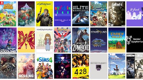 We developed a list of games that were known for trans themes, and/or authored by trans designers, and/or which we had personally found comfort in playing. The list included both indie and mainstream games, such as Cyberpunk 2077, Anna Anthropy’s dys4ia, Animal Crossing: New Horizons and Celeste.