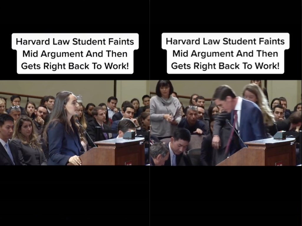 On TikTok, the clip of the incident was shared along with the caption: “Kids that go to Harvard are not human. She’s a trooper,” while the video also included text that read: “Harvard Law student faints mid-argument and then gets right back to work!”