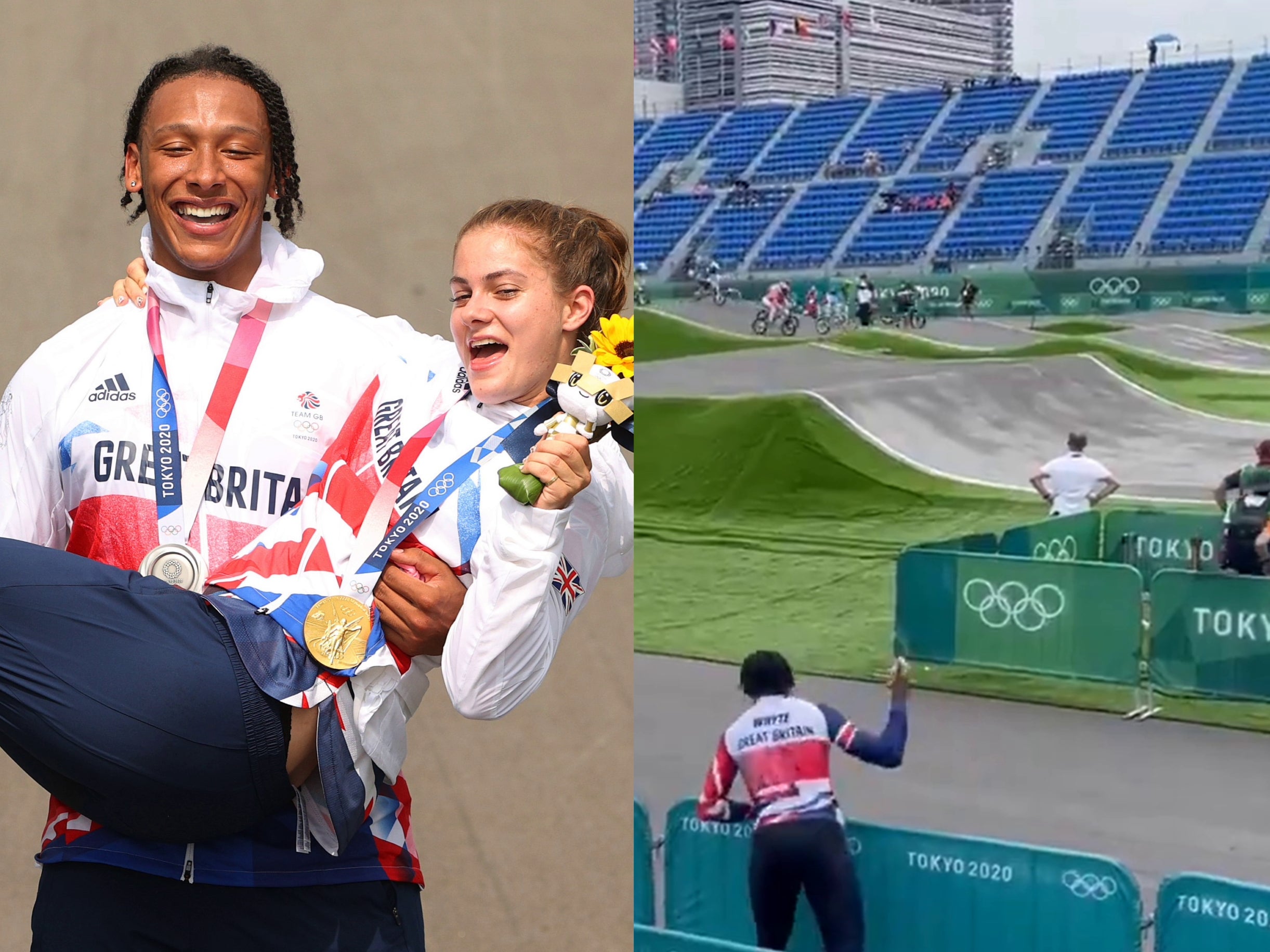 (Left) Kye Whyte and Bethany Shriever celebrate their medal wins. (Right) the sweet clip of Whyte cheering on Shriever during her race where she won gold