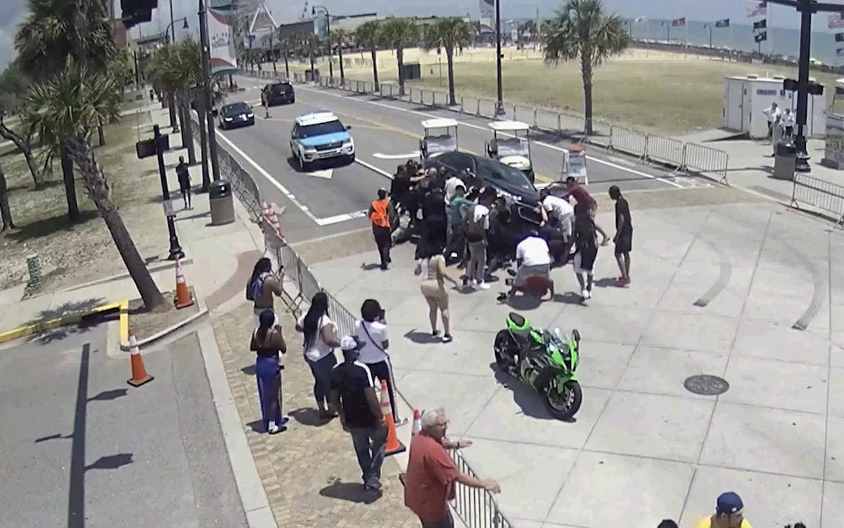 Officers from the Myrtle Beach Police Department then appear, and the group of ordinary citizens and uniformed officers begin lifting the 2,000-pound vehicle off the pinned biker, allowing him to escape to safety.