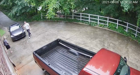 The video shared by Mr Brooks on Twitter shows a car pulling into the driveway and turning into a garage. Another car quickly pulls into the driveway, and a driver – carrying papers and a cellphone – steps out and jogs to the open garage door.