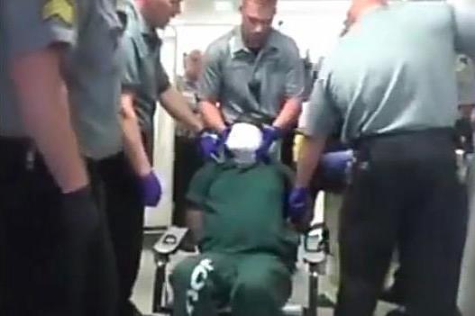 The video shows multiple officers holding a prisoner down as he was restrained upright in a chair following a scuffle, a spit mask wrapped around his face. One officer has a grip on either side of the man’s head as he appears to be having difficulty breathing.
