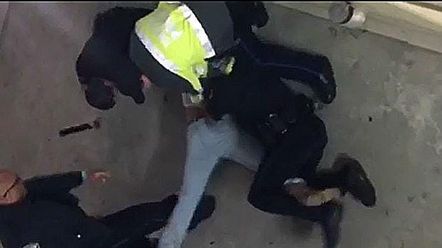 This can also be heard in other videos. Another officer can be seen appearing to strike the arrested man on the back with what appeared to be a flashlight or baton.