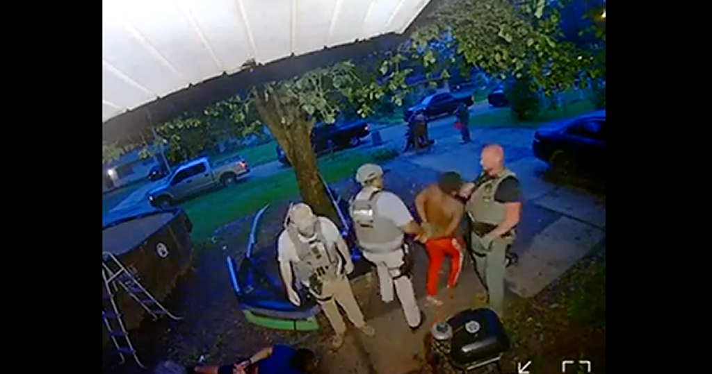 In the clip, which was first shared with news station WLBT from a witness’ Ring home security camera, a shirtless Black man can be seen being led outside in handcuffs, where a ground of heavily armed Marshals, who appear to be white, stand in waiting.