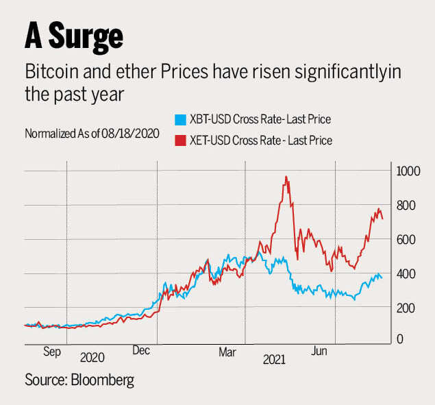 Interest in cryptocurrencies has surged since the onset of the pandemic, in part because of substantial gains by digital tokens like Bitcoin and Ether. The Bloomberg Galaxy Crypto Index has climbed about 380% in the past year.