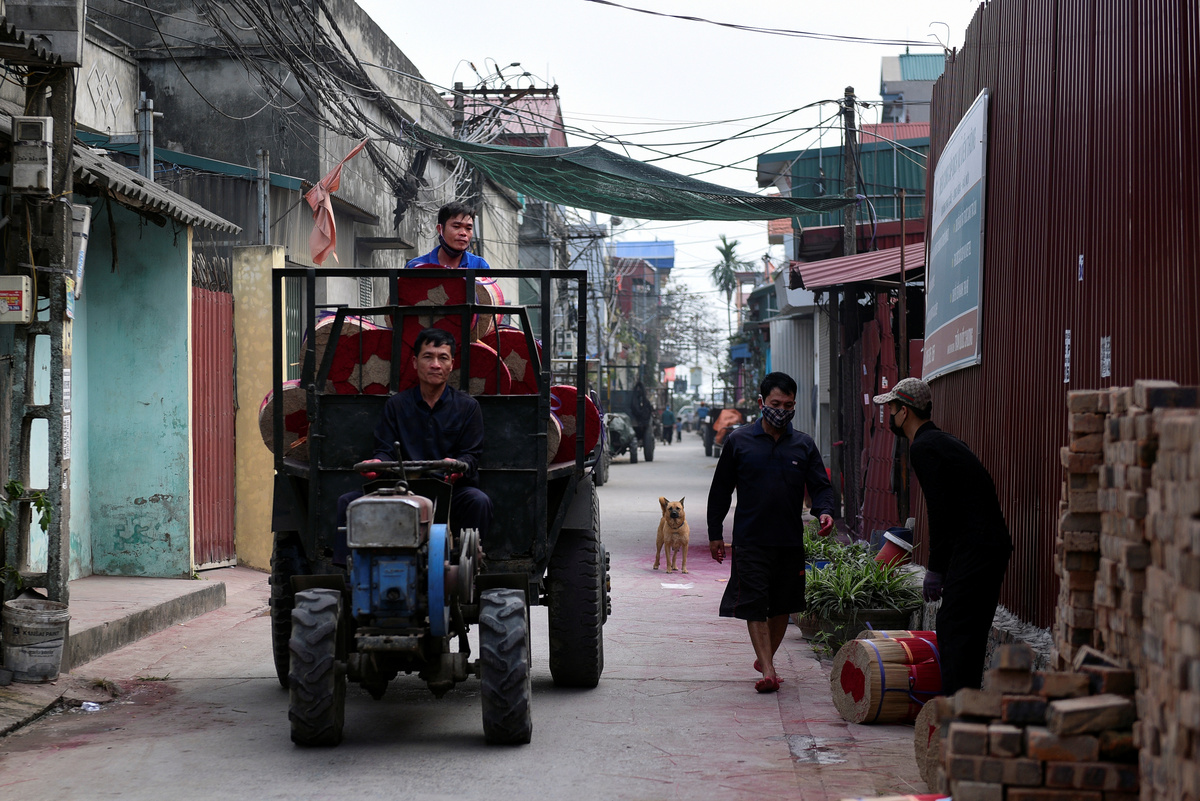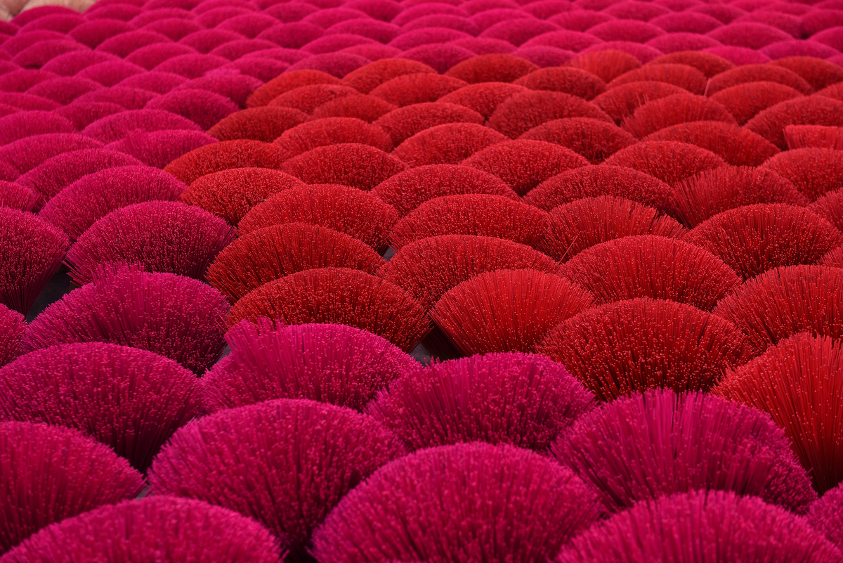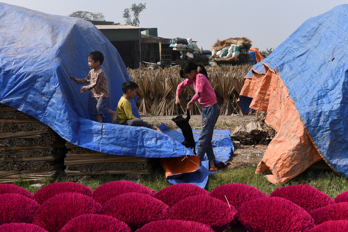 Across this village south of Hanoi, otherwise drab patches of ground blaze with colour as bundles of magenta-tipped incense sticks are left to dry in the sun before being distributed across Vietnam and to other parts of the world.
