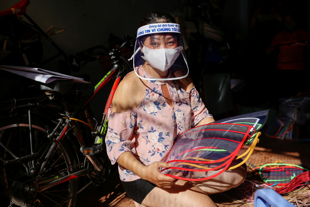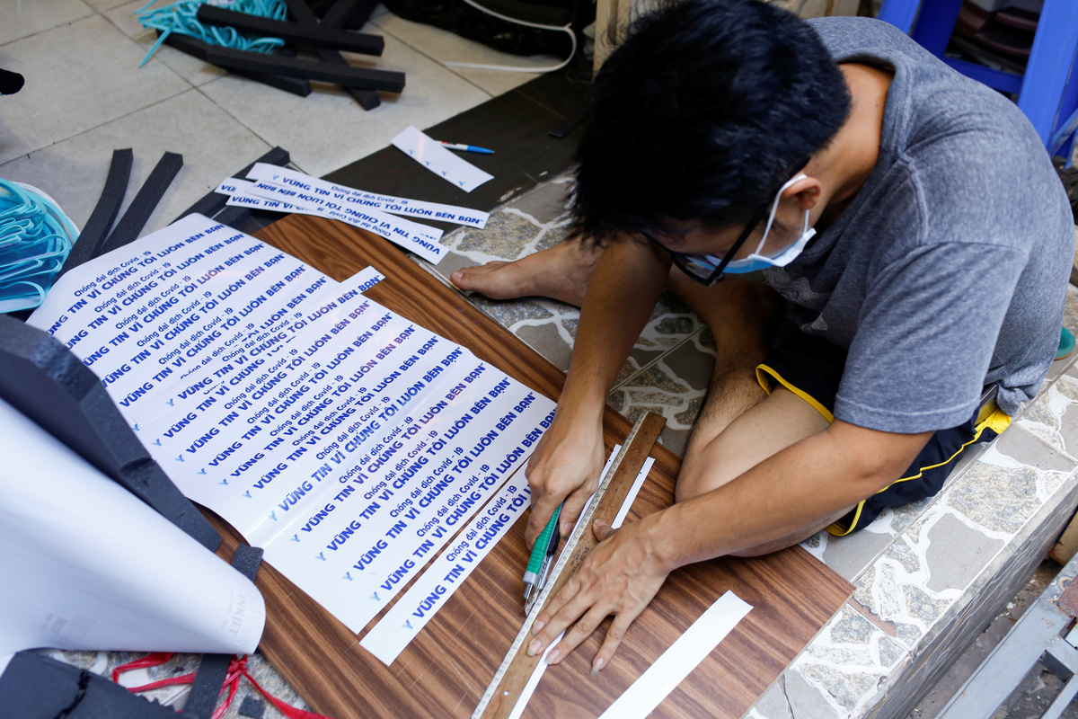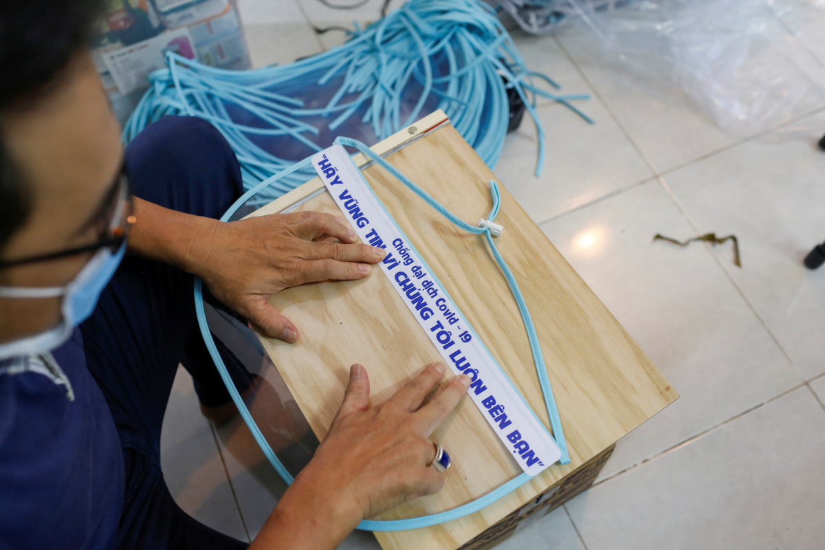 The finishing touch? A sticker, with an important message to Vietnam's medical workers: "Fight Covid-19 disease".