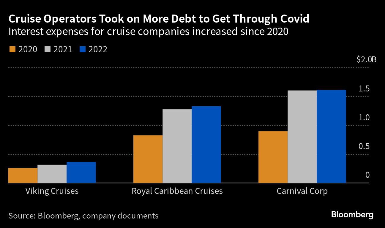 Viking’s interest expenses ballooned 41% between 2020 and 2022. Cruise operators have generally been looking to cut funding costs by selling new notes. Royal Caribbean Cruises Ltd. sold $700 million of junk bonds in February to refinance its debt.