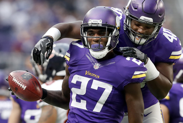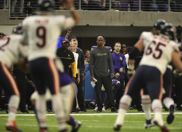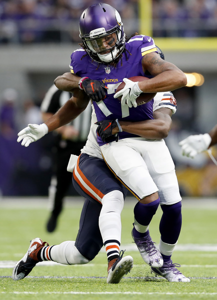 After safety Anthony Harris recovered a fumble by Bears running back Jeremy Langford inside Bears territory, Bradford's second touchdown pass, a 22-yarder to Kyle Rudolph, made it 17-0 in the second quarter.