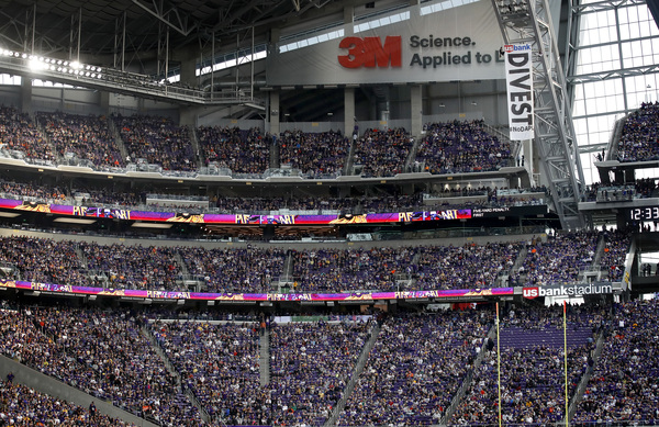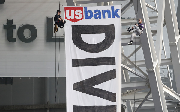 Early in the second quarter, two protesters were spotted dangling from the rafters after unfurling a large banner urging U.S. Bank to divest from the Dakota Access Pipeline. The game continued as the protesters, one wearing a Brett Favre jersey, twirled above through the final whistle.