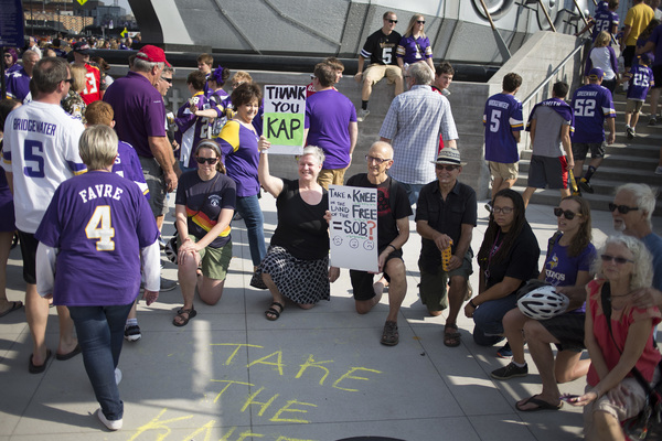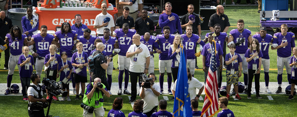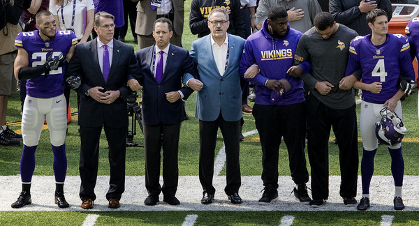 The day began with the team's first public demonstration during a national anthem since former San Francisco 49ers quarterback Colin Kaepernick first knelt during the anthem as a form of protest during the 2016 preseason. No Vikings player had taken action during an anthem before Sunday, when many players linked arms with one another _ as well as owners Zygi and Mark Wilf and general manager Rick Spielman _ following President Trump's comments criticizing NFL players who knelt in protest during the anthem.