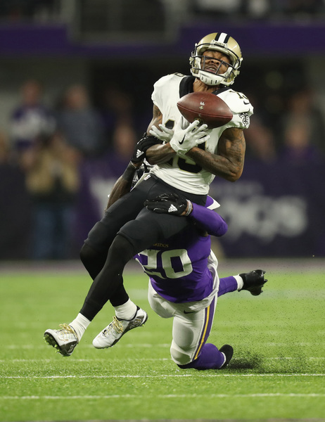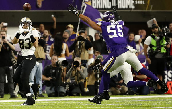 Brees found tight end Josh Hill for 18 yards, hit Ginn for 11, and on 4th-and-10, the quarterback drilled a sideline throw to Snead for 13 yards, beating Mackensie Alexander to keep the Saints' drive _ and their season _ alive. Will Lutz's field goal put New Orleans up 24-23 with 29 seconds left, and as Keenum threw two incomplete passes following a 19-yard completion to Diggs, the Vikings were down to one act of desperation.