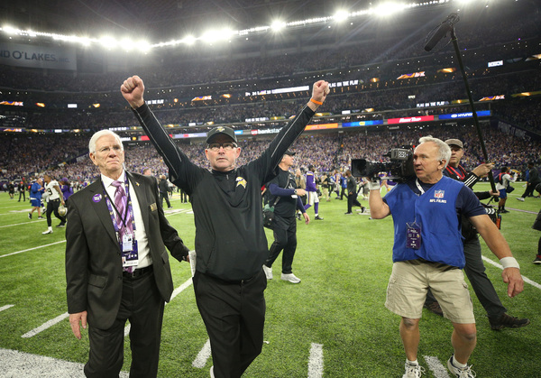 Improbably, the Vikings would need a late comeback to win a game they led 17-0 at halftime. And they got the big play they needed when Keenum threw a pass off his back foot for Adam Thielen, hitting the receiver for 24 yards in front of the Vikings' bench. Coach Mike Zimmer slapped Thielen on the backside, and after Keenum's deep heave was broken up on third down, Forbath drilled a 53-yard field goal to put the Vikings up 23-21 with 1:29 left.