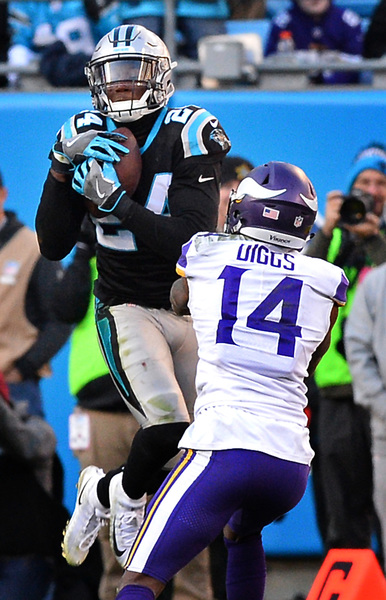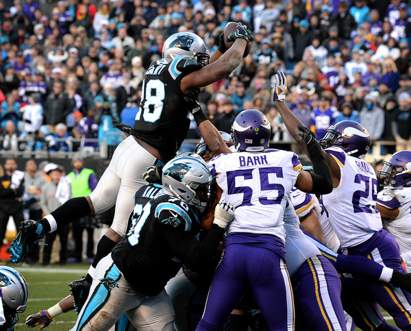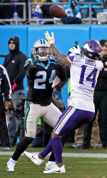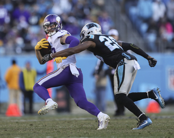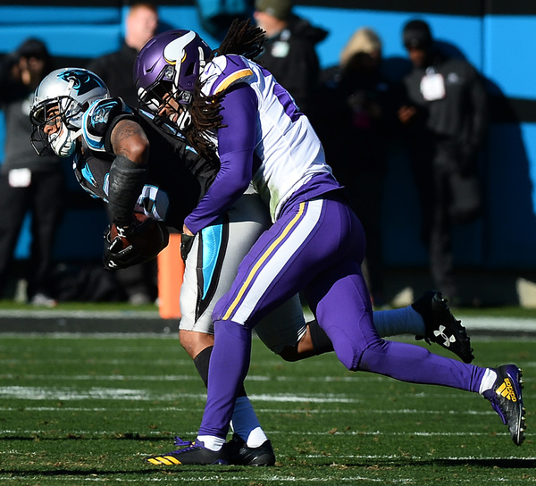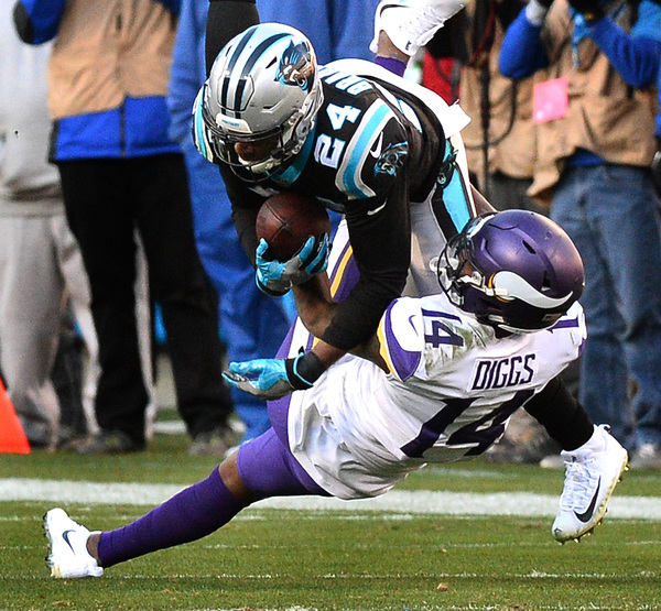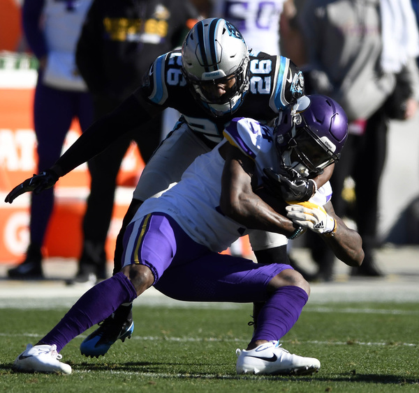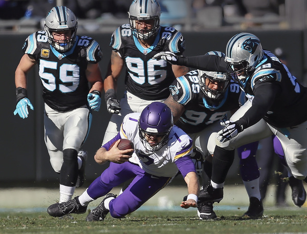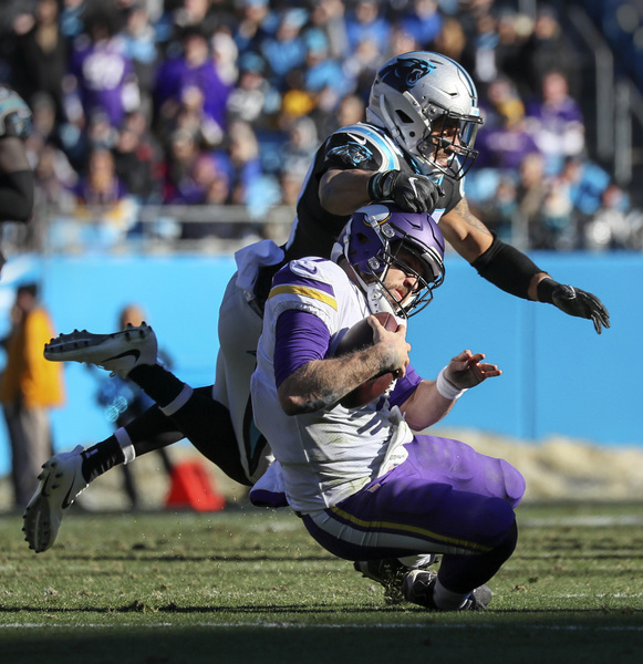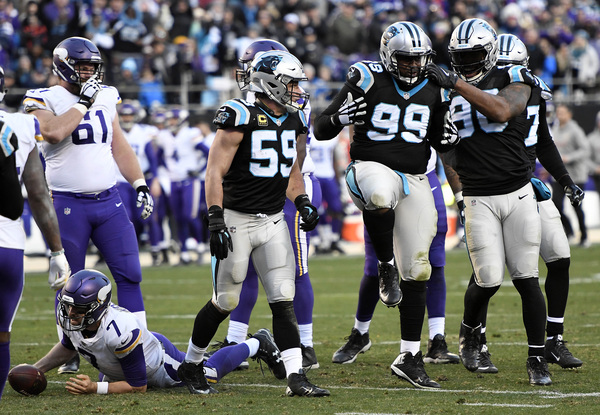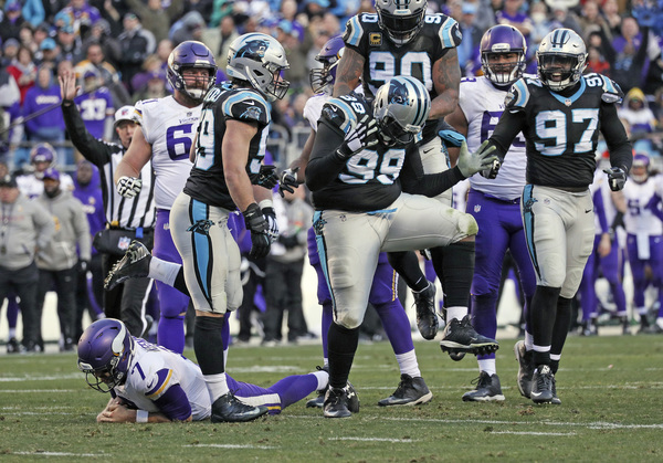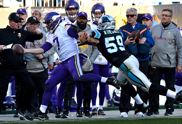 On the Vikings' first play of the third quarter, Mario Addison beat Riley Reiff with a speed rush and swatted the ball out of Keenum's hand as he tried to throw downfield. The Panthers recovered the fumble as it shot forward, and reviews upheld the fumble call. With the Vikings down 24-13 in the fourth quarter, James Bradberry picked off a Keenum pass that Stefon Diggs deflected into the air.
