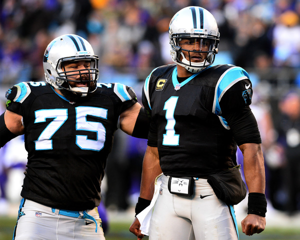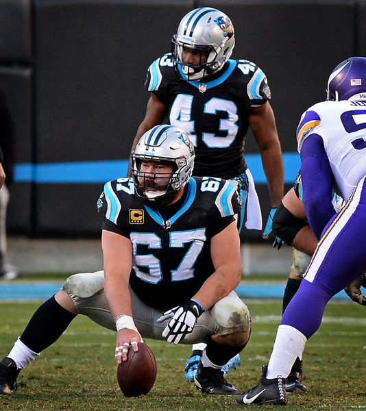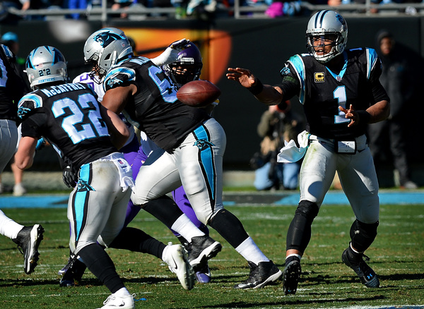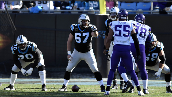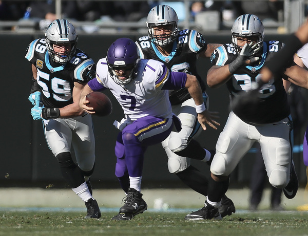 Case Keenum completed 27 of his 44 passes behind the battered offensive line, ducking away from a Captain Munnerlyn sack on a corner blitz and finding space in the middle of the Panthers' rush lanes to gain 43 yards on five scrambles. He finished the day with three turnovers, getting hit as he underthrew a deep ball that Daryl Worley intercepted in the first quarter.