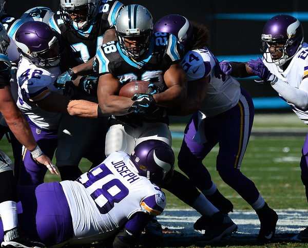 He scooted through a hole off the left side of the Panthers' line, eluding Snedejo's tackle attempt for a 62-yard run that put the Panthers at the Vikings' 8 with just over two minutes to play. Stewart _ who started the scoring with a 60-yard touchdown run off Keenum's first interception _ jumped over the goal line for his third score of the day to put Carolina up for good.