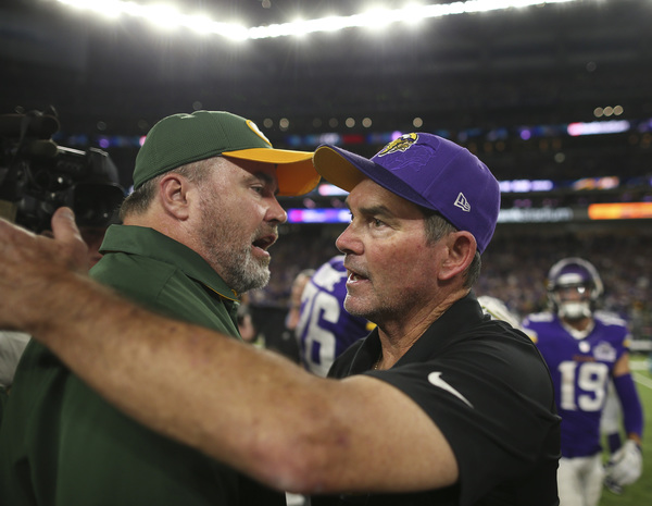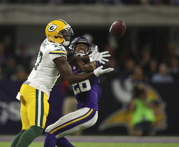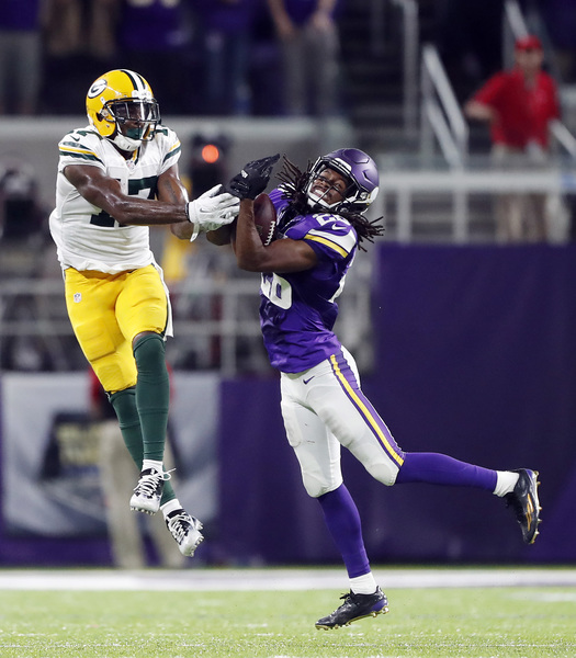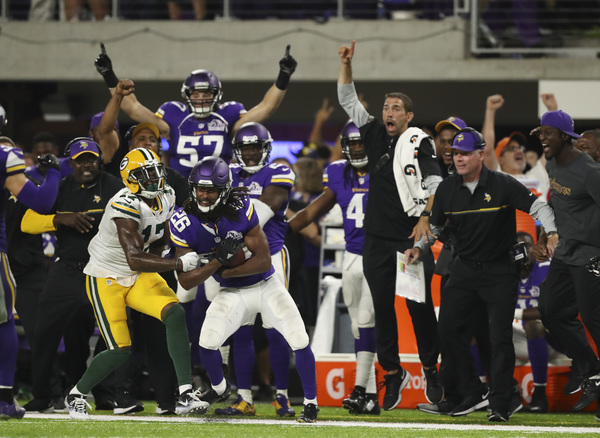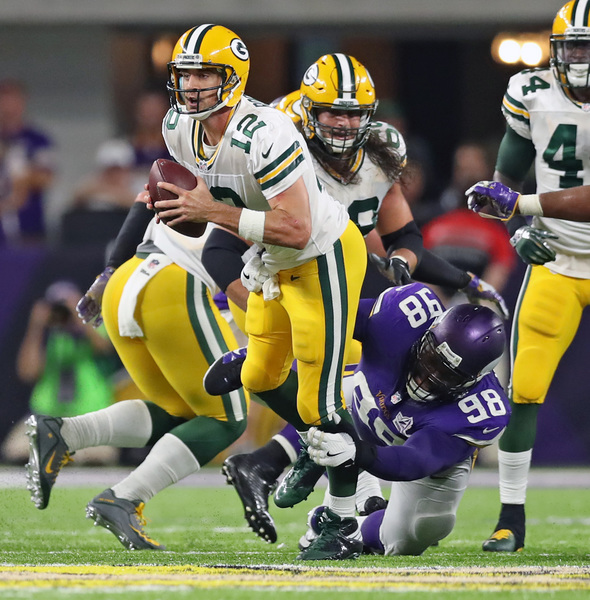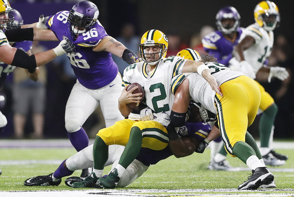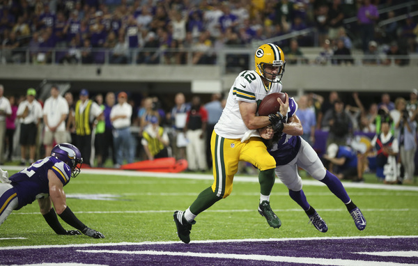 Packers quarterback Aaron Rodgers was intercepted by Trae Waynes with 1:50 remaining to seal the victory for the Vikings (2-0). Rodgers had a career-high three fumbles, two of which were recovered by his own team, and passed for 213 yards.