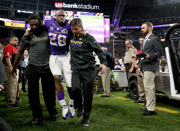 But the Vikings, who have already lost quarterback Teddy Bridgewater for the season because of a knee injury, appeared to suffer another key injury. Running back Adrian Peterson left in the third quarter because of a right knee injury after twisting his leg while being tackled. He was carried into the locker room.