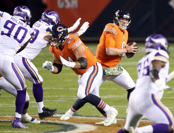 On the Vikings' first offensive possession, Kyle Rudolph lost a fumble for the first time since 2014, when Bears linebacker Danny Trevathan punched the ball out just as the tight end's right knee was going to the ground. A replay didn't produce enough evidence to overturn the call on the field, though the Vikings got the ball back two plays later after Foles' throw was late and high to Anthony Miller, bouncing off the receiver's hands into the waiting arms of Harrison Smith.