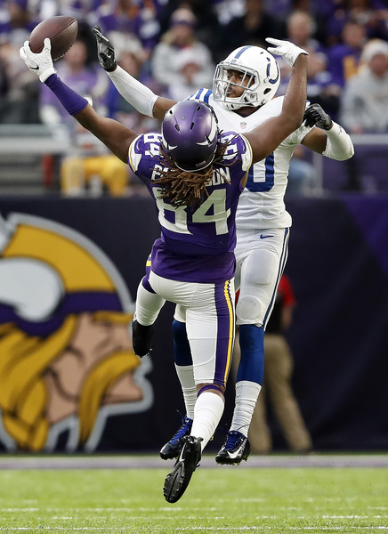 The Vikings finally got something going offensively before halftime, with a 28-yard catch by tight end Kyle Rudolph getting them to the 22-yard line. But Peterson, fighting for a few more inches at the end of a 13-yard run, coughed up the football and Colts safety Mike Adams snatched it up.