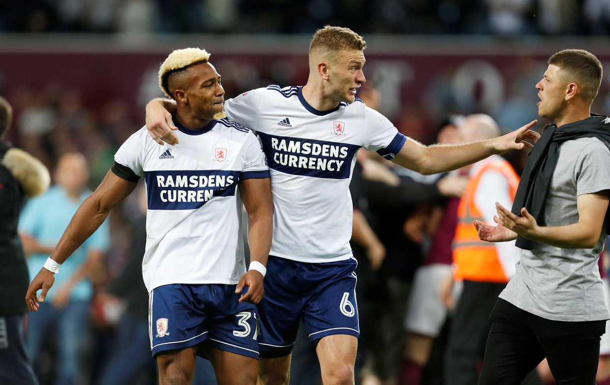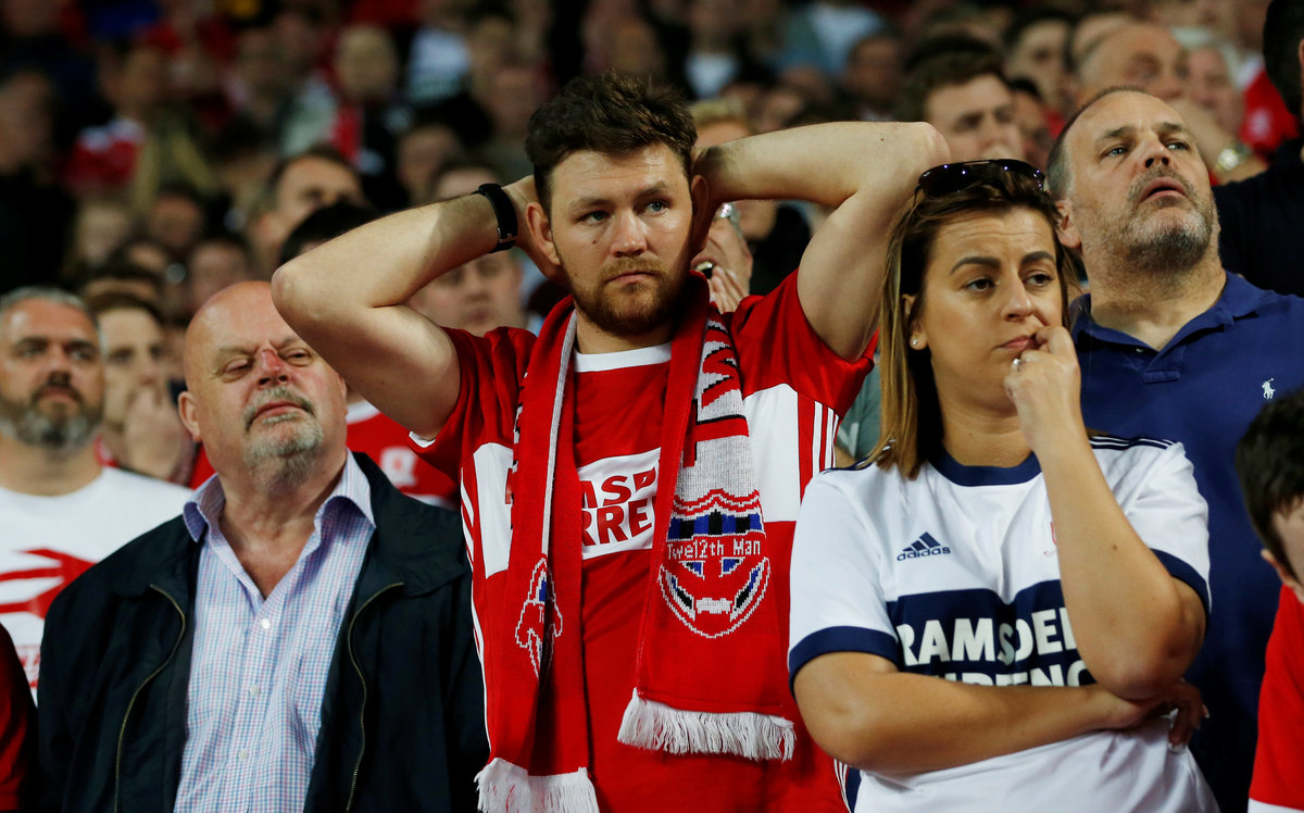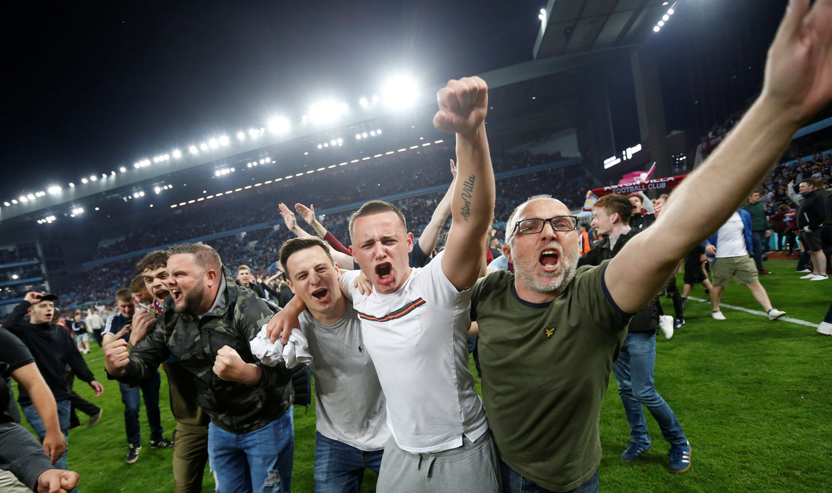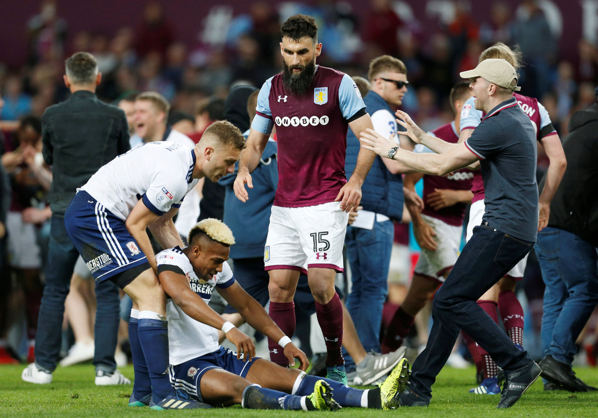 Soccer Football - Championship Play Off Semi Final Second Leg - Aston Villa v Middlesbrough - Villa Park, Birmingham, Britain - May 15, 2018 Aston Villa fan holds up a poster as he celebrates after the match Action Images via Reuters/Craig Brough Soccer Football - Championship Play Off Semi Final Second Leg - Aston Villa v Middlesbrough - Villa Park, Birmingham, Britain - May 15, 2018 Aston Villa's Jack Grealish and Albert Adomah in action with Middlesbrough's Adama Traore Action Images via Reuters/Ed Sykes Soccer Football - Championship Play Off Semi Final Second Leg - Aston Villa v Middlesbrough - Villa Park, Birmingham, Britain - May 15, 2018 Middlesbrough fan looks dejected after the match Action Images via Reuters/Ed Sykes Soccer Football - Championship Play Off Semi Final Second Leg - Aston Villa v Middlesbrough - Villa Park, Birmingham, Britain - May 15, 2018 Middlesbrough's Adama Traore is helped up by Middlesbrough's Ben Gibson and Aston Villa's Mile Jedinak after the match Action Images via Reuters/Ed Sykes Soccer Football - Championship Play Off Semi Final Second Leg - Aston Villa v Middlesbrough - Villa Park, Birmingham, Britain - May 15, 2018 Middlesbrough's Adama Traore looks dejected after the match. Action Images via Reuters/Ed Sykes Soccer Football - Championship Play Off Semi Final Second Leg - Aston Villa v Middlesbrough - Villa Park, Birmingham, Britain - May 15, 2018 Middlesbrough's Adama Traore and Ben Gibson look dejected as a fan looks on after the match. Action Images via Reuters/Ed Sykes Soccer Football - Championship Play Off Semi Final Second Leg - Aston Villa v Middlesbrough - Villa Park, Birmingham, Britain - May 15, 2018 Middlesbrough's Adama Traore and Ben Gibson look dejected as a fan looks on after the match Action Images via Reuters/Ed Sykes Soccer Football - Championship Play Off Semi Final Second Leg - Aston Villa v Middlesbrough - Villa Park, Birmingham, Britain - May 15, 2018 Aston Villa fans invade the pitch after the game Action Images via Reuters/Ed Sykes Soccer Football - Championship Play Off Semi Final Second Leg - Aston Villa v Middlesbrough - Villa Park, Birmingham, Britain - May 15, 2018 Aston Villa fans invade the pitch after the game Action Images via Reuters/Ed SykesSoccer Football - Championship Play Off Semi Final Second Leg - Aston Villa v Middlesbrough - Villa Park, Birmingham, Britain - May 15, 2018 Middlesbrough's Rudy Gestede looks dejected as he gives his shirt to a fan after the game Action Images via Reuters/Ed Sykes