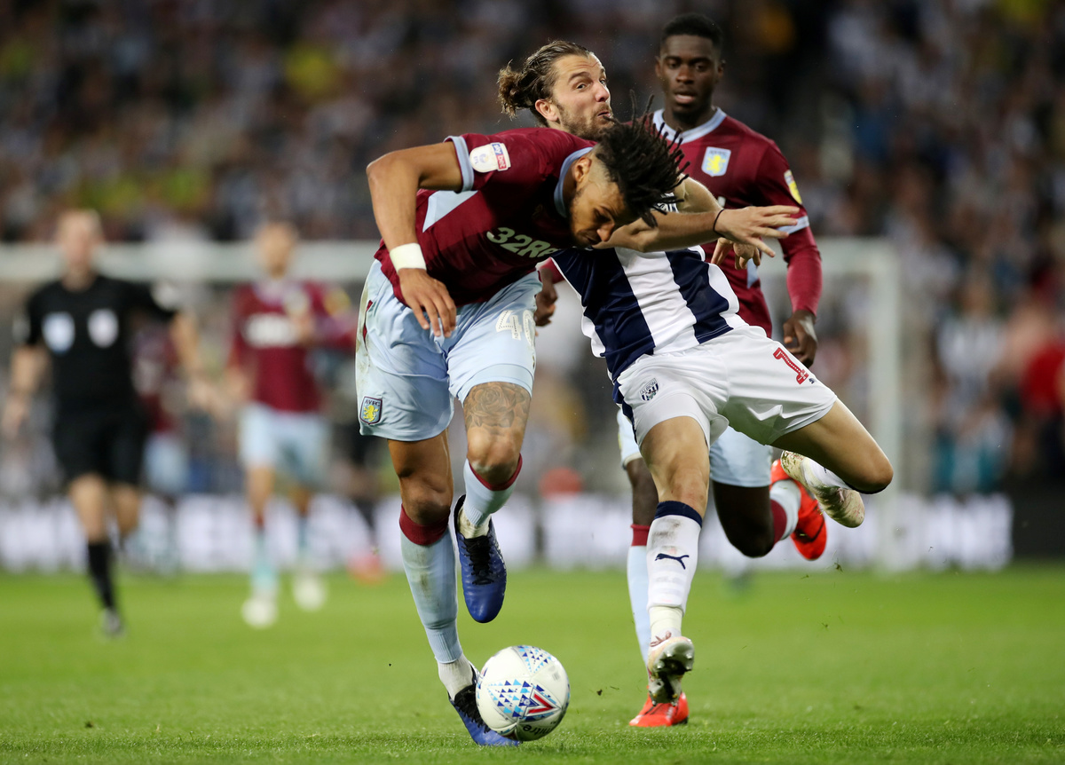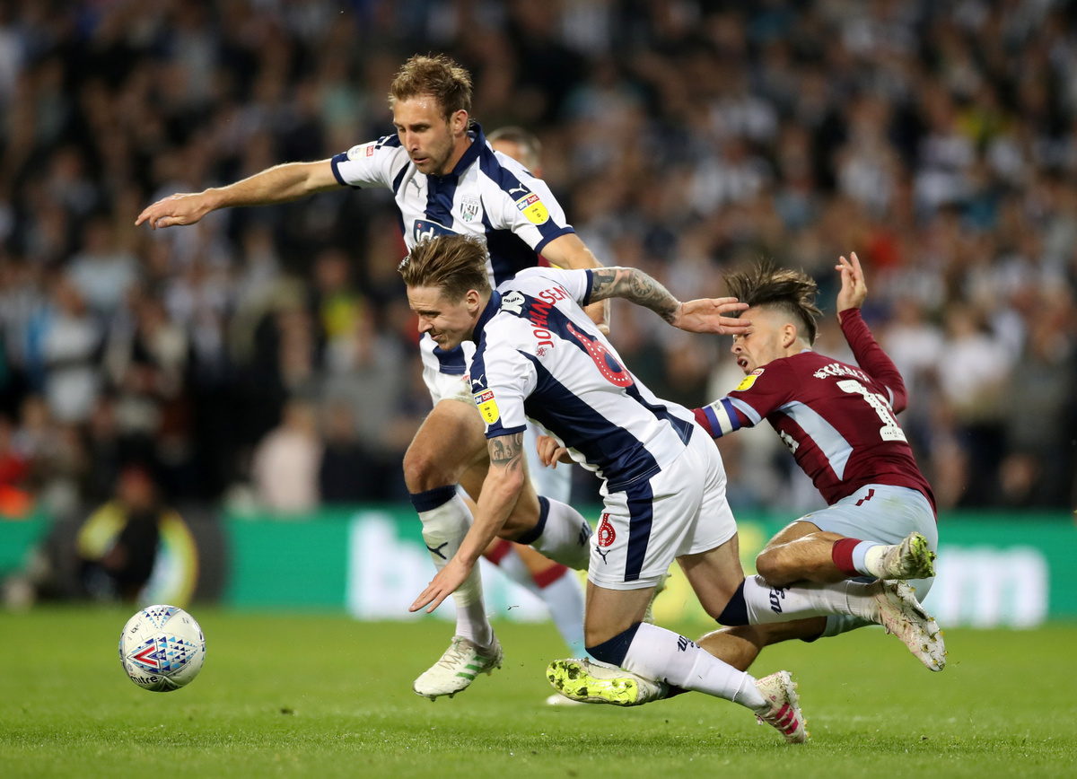 Soccer Football - Championship Play-Off Semi Final Second Leg - West Bromwich Albion v Aston Villa - The Hawthorns, West Bromwich, Britain - May 14, 2019 West Bromwich Albion's Stefan Johansen is booked for this challenge on Aston Villa's Jack Grealish Action Images via Reuters/Carl Recine