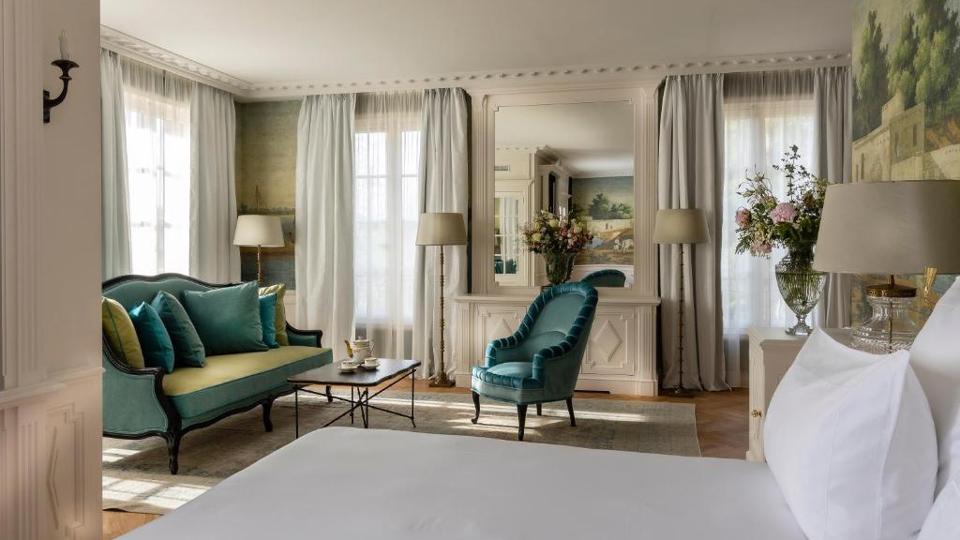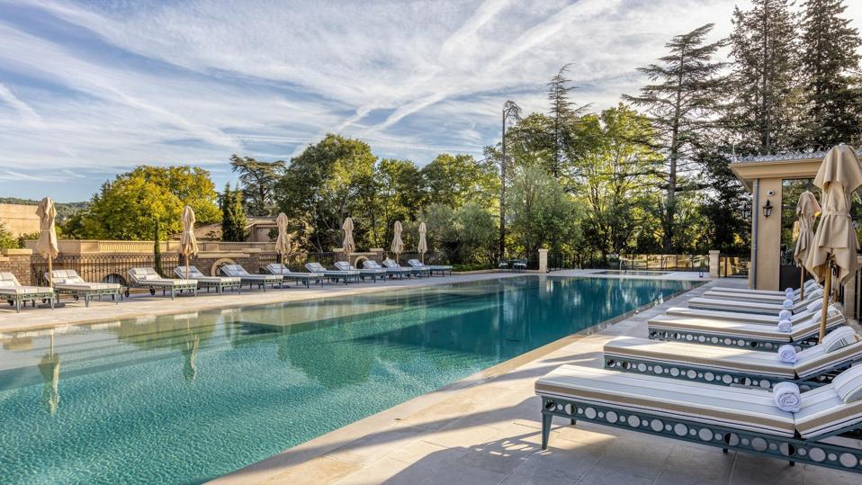 The clutch of ochre-hued buildings are dotted around leafy gardens where nineteenth-century sculptures lead to a bright turquoise pool that lures guests to its heated waters year-around. Rooms look out onto the idyllic surroundings, big double windows letting in plenty of that magical golden light Provence is known for.