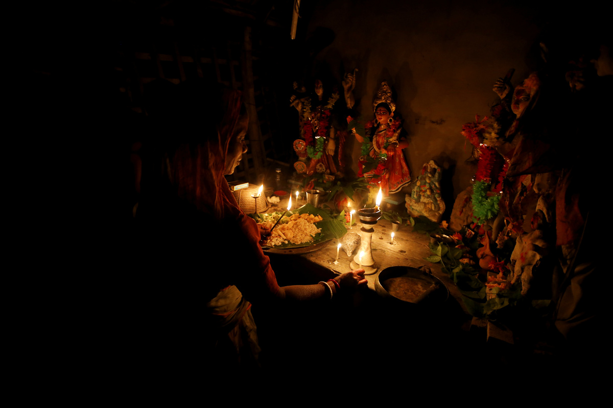 A Hindu woman lights a candle as she worships the Hindu goddess of wealth Laxmi in her house on the occasion of Laxmi Puja festival on Ghoramara Island, India, October 24, 2018. REUTERS/Rupak De Chowdhuri