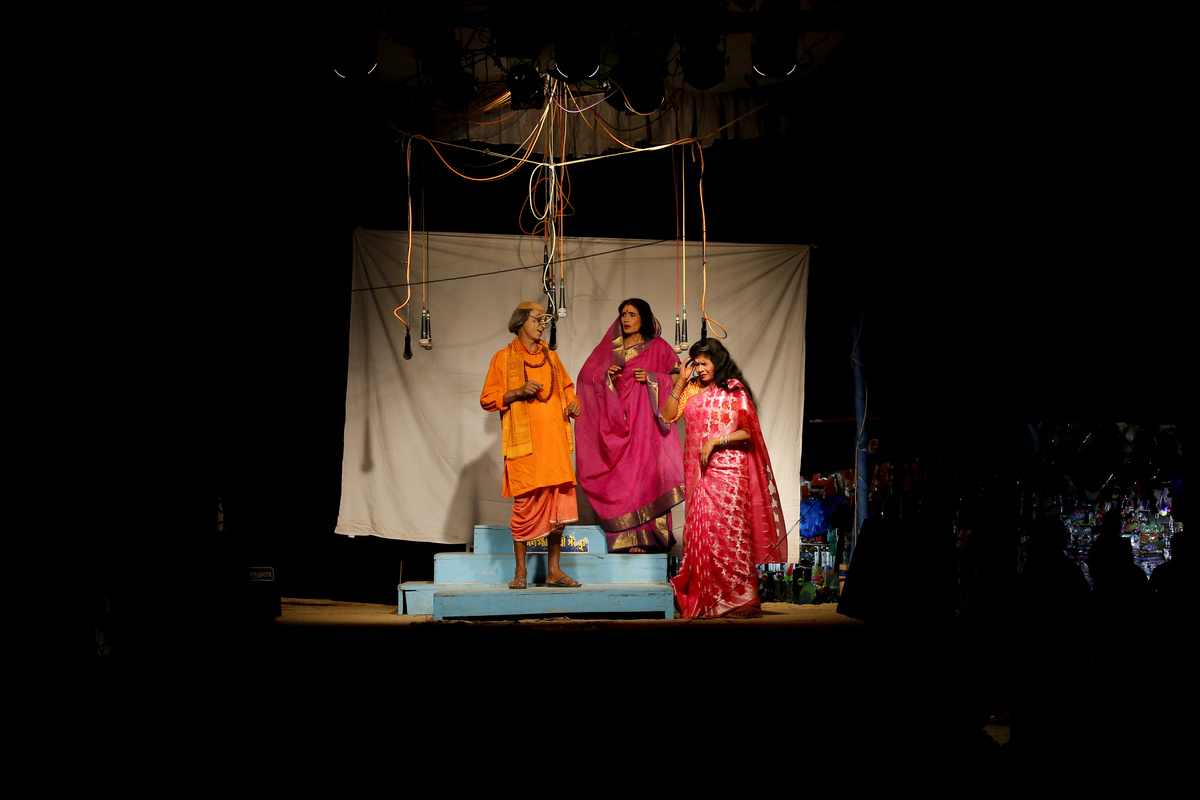 Folk theatre actors perform at a makeshift theatre Jatra during annual Hindu festival of Jagadhatri Puja on Ghoramara Island, India, November 18, 2018. REUTERS/Rupak De Chowdhuri
