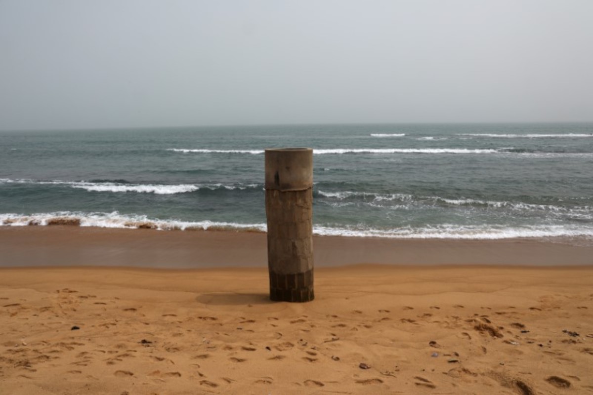 FILE PHOTO: The remains of a well that has been exposed in the sand due to costal erosion and sea storms are seen on the sandy beach of Baguida, a suburb of Lome, Togo, February 16, 2020. REUTERS/Luc Gnago